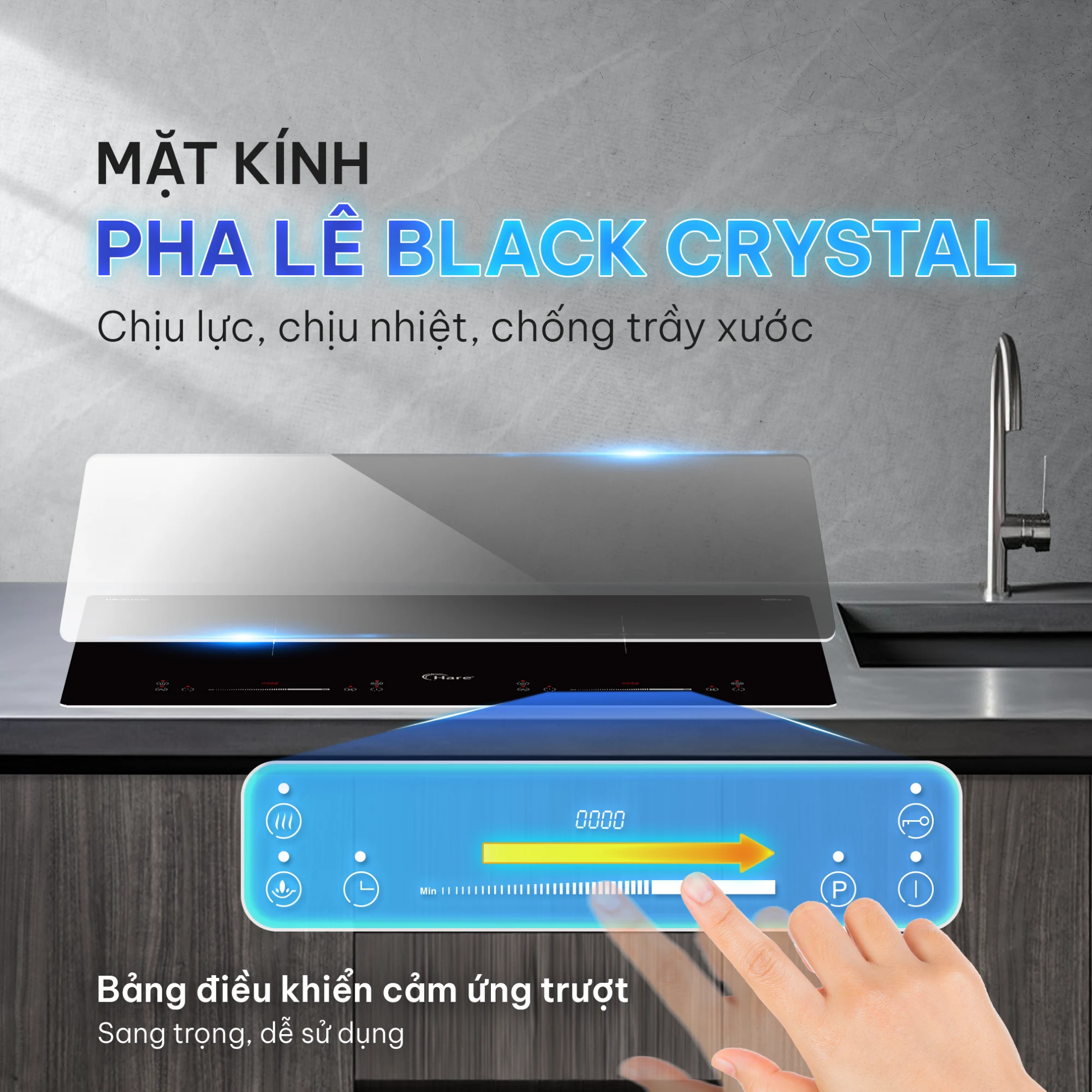 Mặt bếp được làm từ kính pha lê Black Crystal cao cấp, chịu lực, chịu nhiệt tốt, dễ vệ sinh và luôn giữ được vẻ sáng bóng như mới.