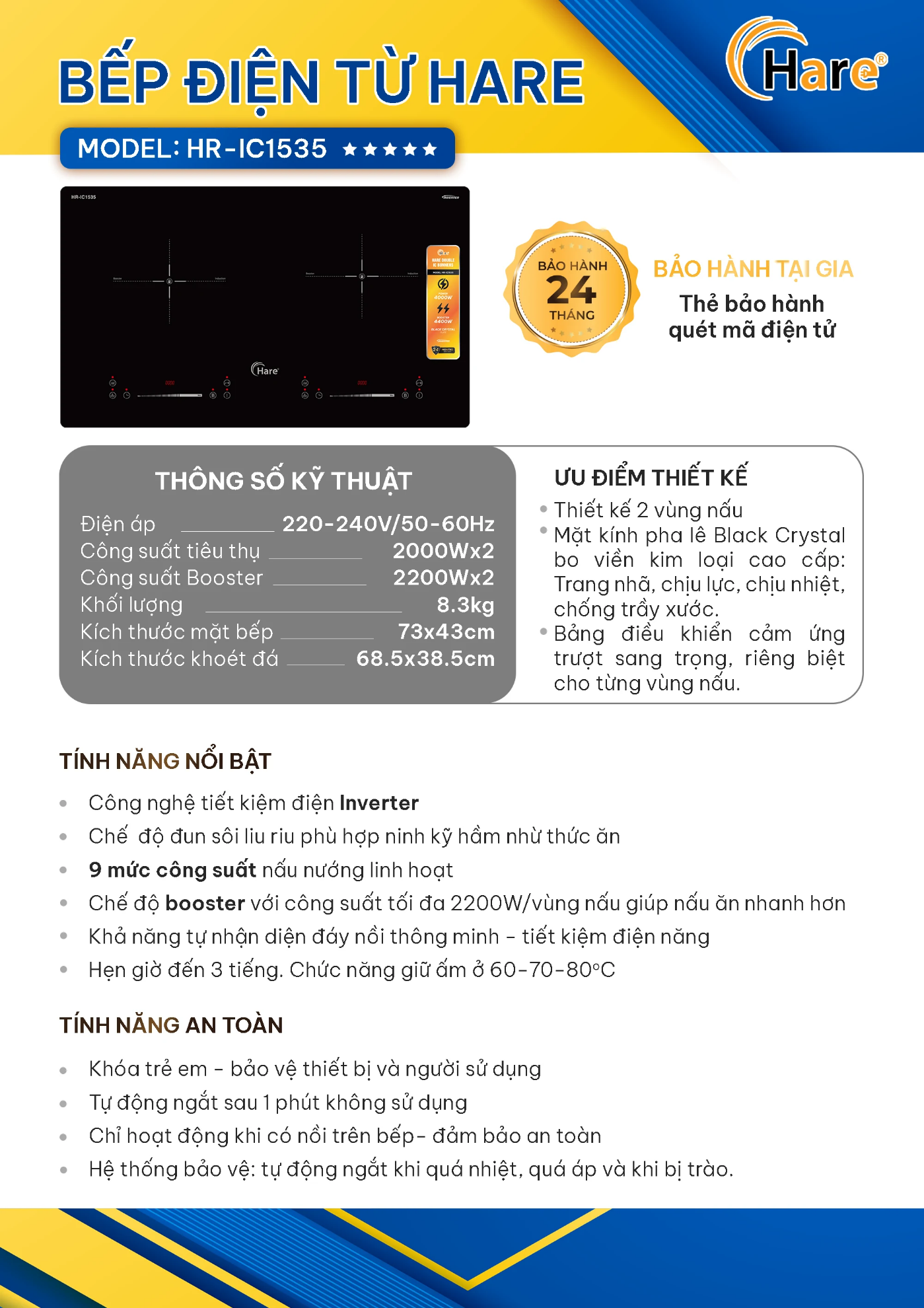 Với thiết kế tinh tế, hiệu suất mạnh mẽ, công nghệ hiện đại và hàng loạt tính năng an toàn, Hare HR-IC1535 chính là sự lựa chọn tuyệt vời cho mọi gia đình mong muốn một chiếc bếp vừa đẹp, vừa bền, vừa tiết kiệm.