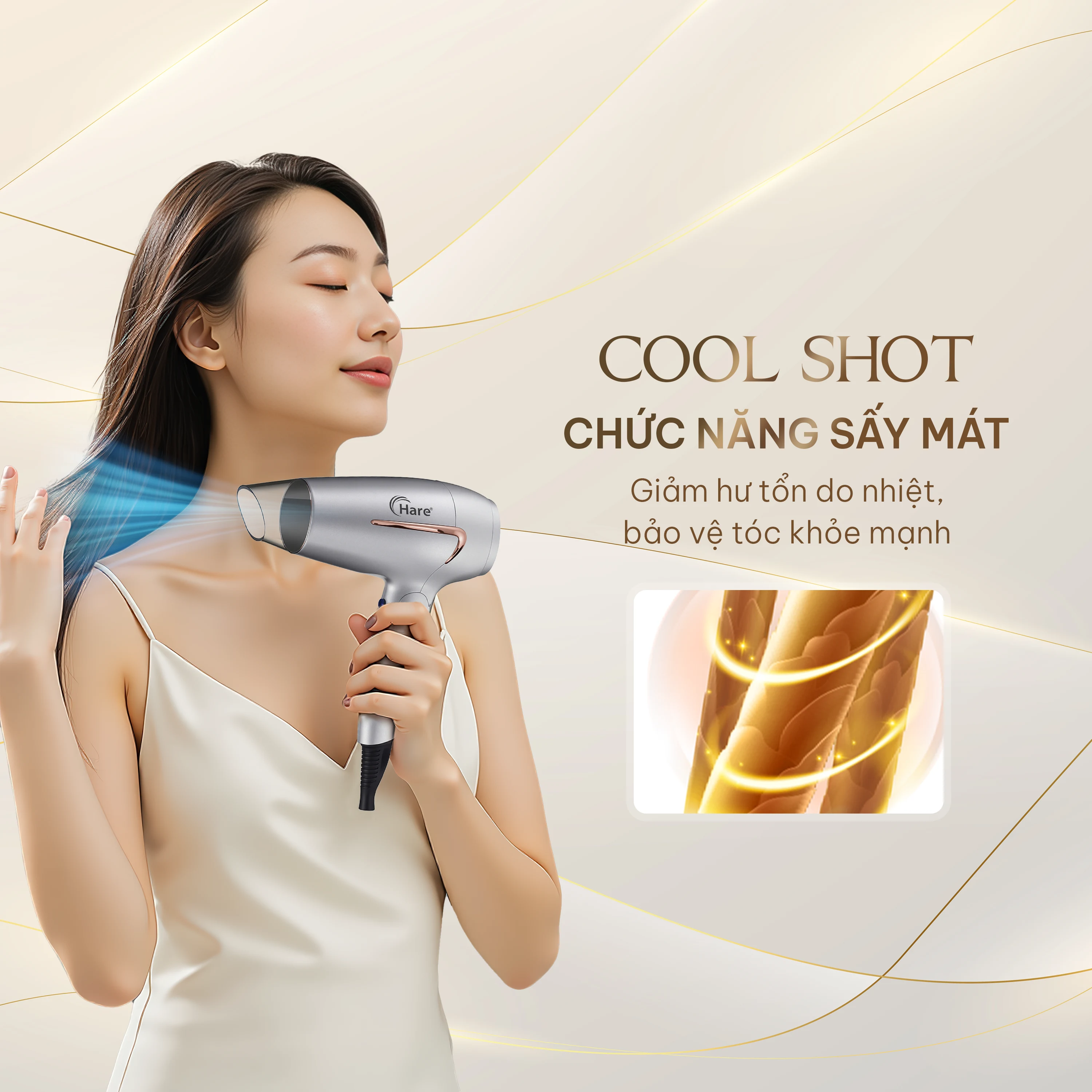 Tính năng Cool Shot (luồng gió mát) giúp khóa nếp tóc sau khi sấy, giảm tác động nhiệt lên tóc, giữ cho mái tóc mềm mượt và óng ả tự nhiên.