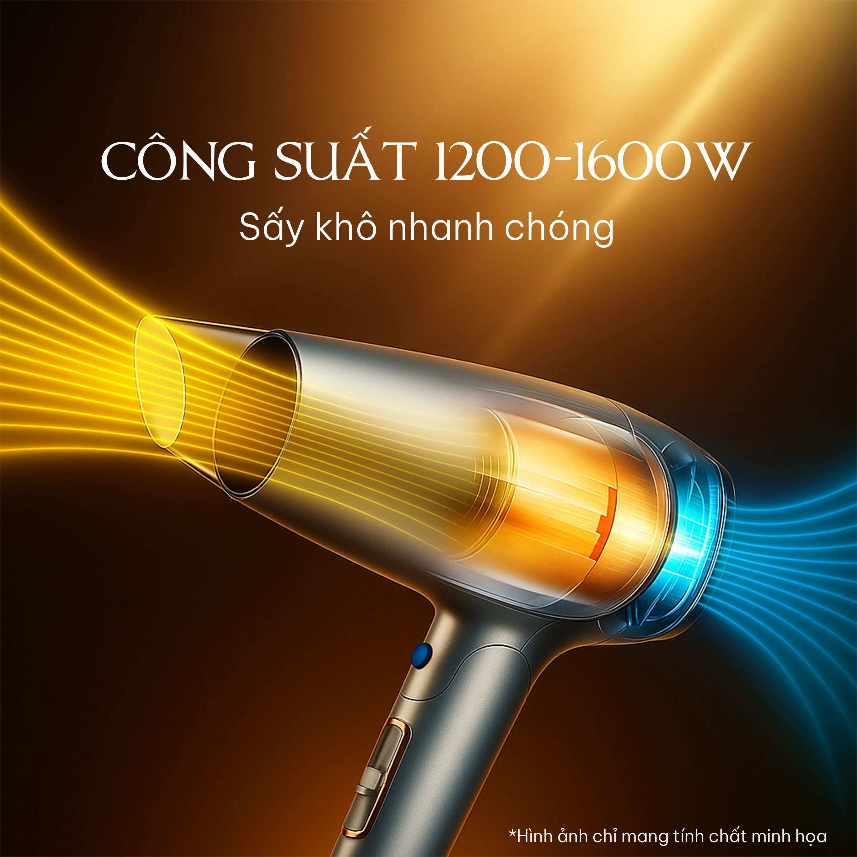 Với công suất 1200–1600W, máy mang đến luồng gió mạnh mẽ, giúp sấy khô tóc nhanh chóng mà vẫn tiết kiệm điện năng. Động cơ DC hoạt động êm ái, bền bỉ, đảm bảo hiệu quả sấy ổn định trong thời gian dài.
