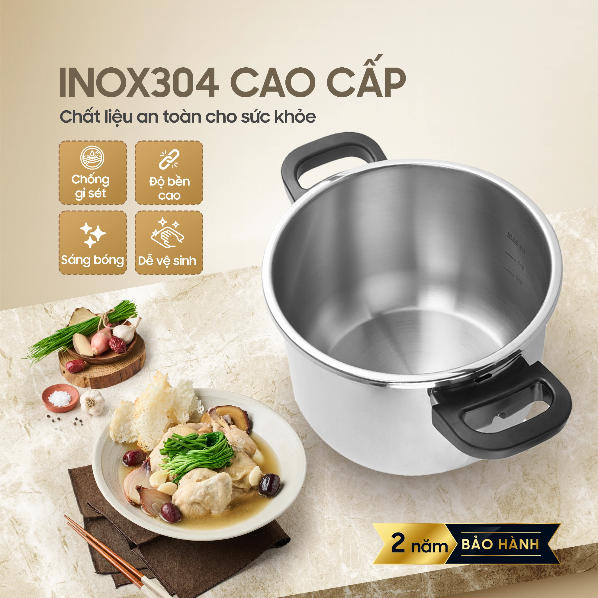 Toàn bộ thân nồi được chế tác từ Inox 304 cao cấp. Đây là chất liệu "vàng" trong ngành gia dụng nhờ khả năng: