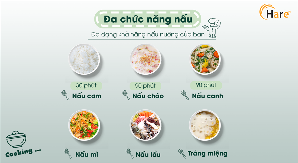Nồi cơm điện được thiết kế với khả năng nấu nhiều cách khác nhau, bên cạnh chức năng nấu cơm, người dùng còn có các lựa chọn: nấu, cháo, nấu canh, nấu mì, nấu lẩu, ...